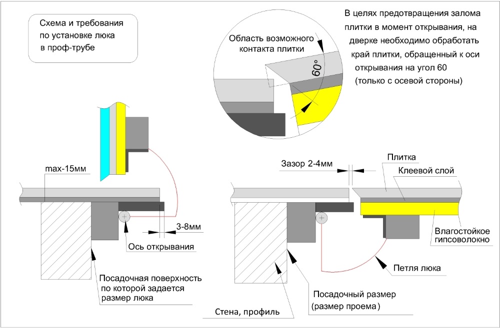 Полотно рассчитывается под нагрузку плитки 900х500 с клеевым слоем. Регламентный вылет декоративного материала за каркас полотна: 10 мм с трех сторон. По стороне оси открывания предписана фиксированная привязка к монтажной схеме. Если нужен свес керамики до 20 мм, обязательно укажите это при открытии заказа для выставления положения амортизаторов.