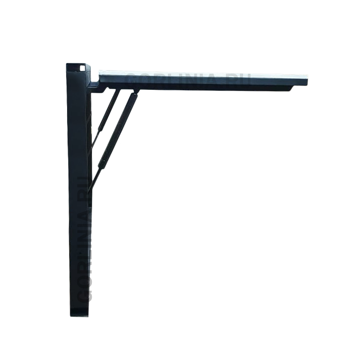 Дверца 880х478 с одной осью вращения поднимается на 90°. Амортизаторы выставлены на удержание веса 2-4 кг статической нагрузки в открытом положении. При опускании после 2/3 хода створка становится практически статичной. На последних 5° поджимается к уплотнителю четверти коробки обратной тягой доводчика.