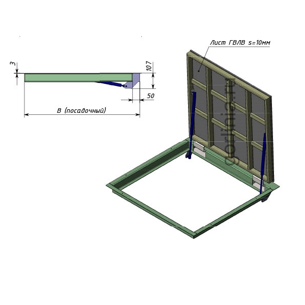 Каркас полотна сварен из трубы 30х20 в комбинированных положениях с заполнением ГВЛ в уровень наличника коробки под отделку плиткой с эффектом невидимки, сохранением рисунка и швов раскладки керамогранита в помещении. Для открывания лаза в подвал 1150х500 используется съемная ручка.