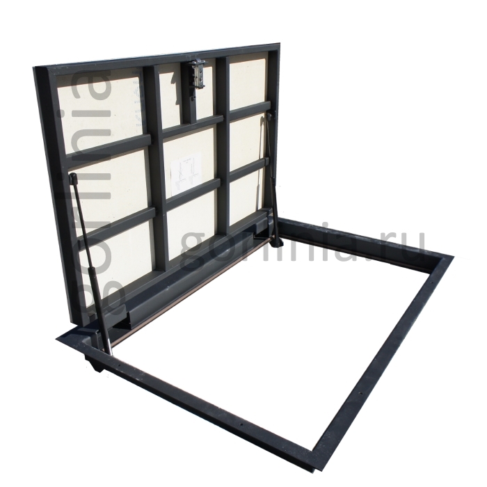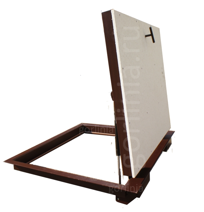 Облегченная коробка из профилированного листового проката 3 мм с наличником 35 мм (10 со стороны открывания) - есть требования по установке, предварительная консультация обязательна! Каркас дверки с обвязкой сварен из трубы 30х20, заполнен ГВЛ под чистовую отделку. Конструкция смещенного за ось шарнирного соединения сохраняет лаза в чистоте 1150х600 для удобства спуска по лестнице в подвал.