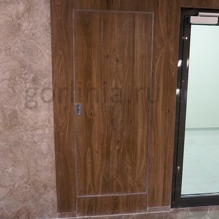 Створка распашная, открывается на себя на опорных подшипниках осевых петель. Заполнена листами ГВЛ и ГСП-DF с минватой в полости. Класс огнестойкости EIS 60. Сертифицировано.